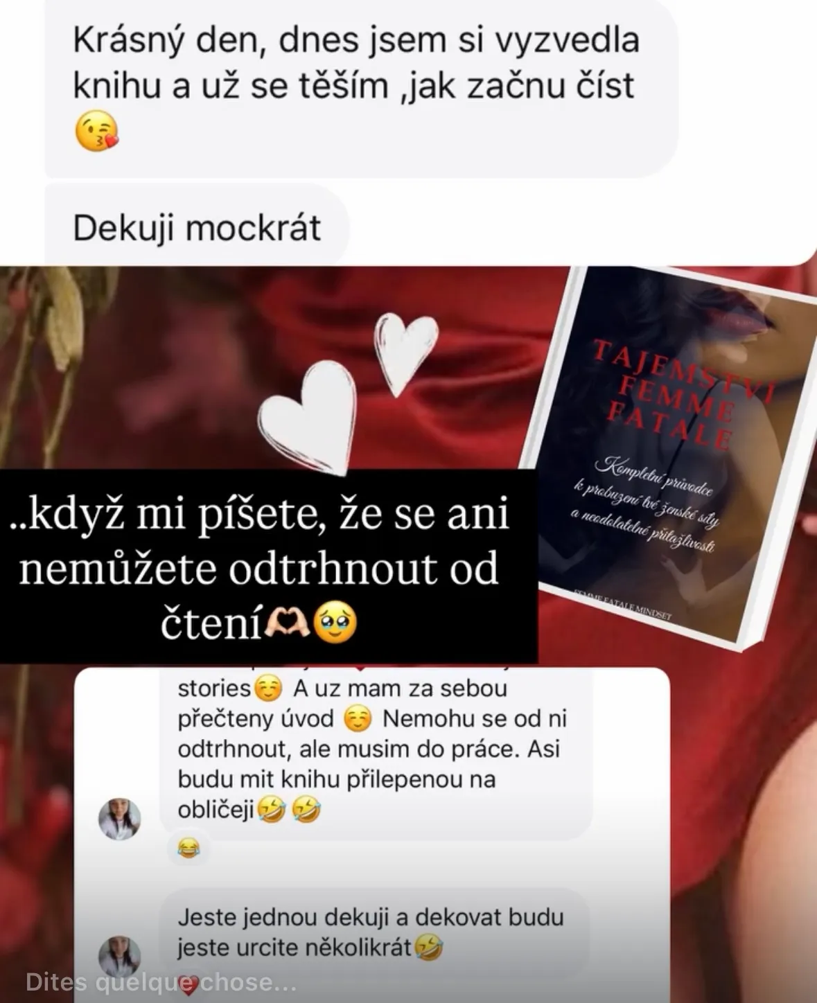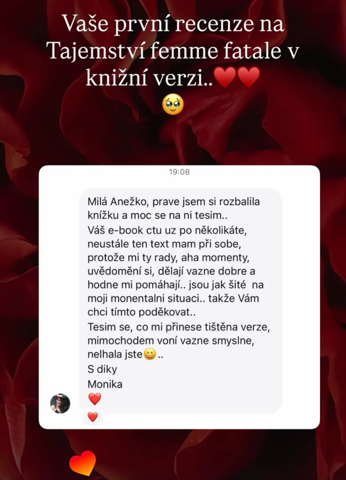 Tato kniha není jen na čtení. Je to smyslný rituál, který tě obklopí svou vůní ještě předtím, než otevřeš první stránku. Každý výtisk osobně parfémuji svým oblíbeným svůdným parfémem, co jsem si dovezla z Paříže – tajemnou esencí, která je určená jen pro mé femmes fatales.