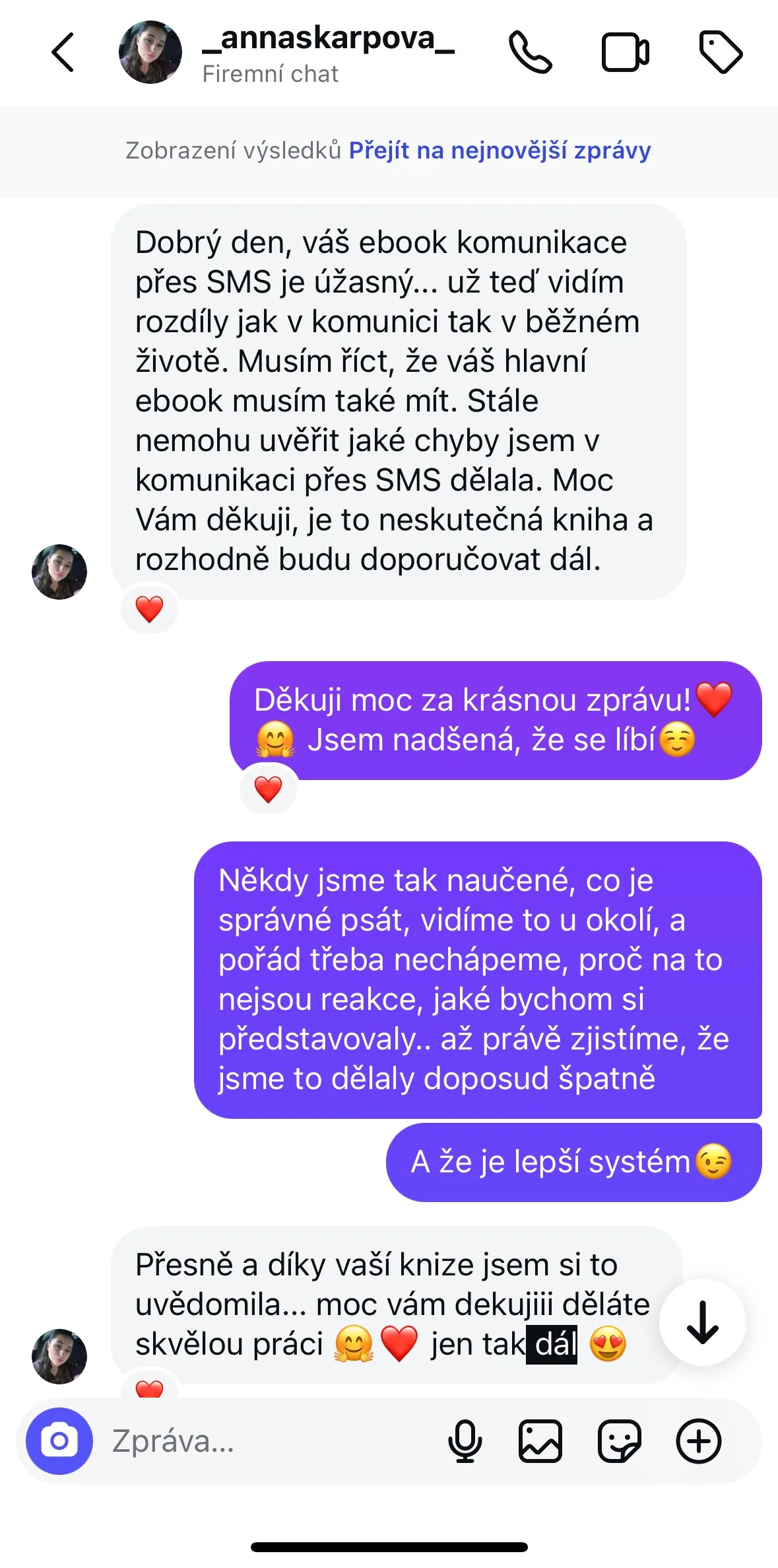 Váš ebook komunikace přes SMS je úžasný… už teď vidím rozdíly jak v komunikaci, tak v běžném životě. Musím říct, že váš hlavní ebook musím také mít. Stále nemohu uvěřit, jaké chyby jsem v komunikaci přes SMS dělala. Moc Vám děkuji, je to neskutečná kniha a rozhodně budu doporučovat dál. ❤️